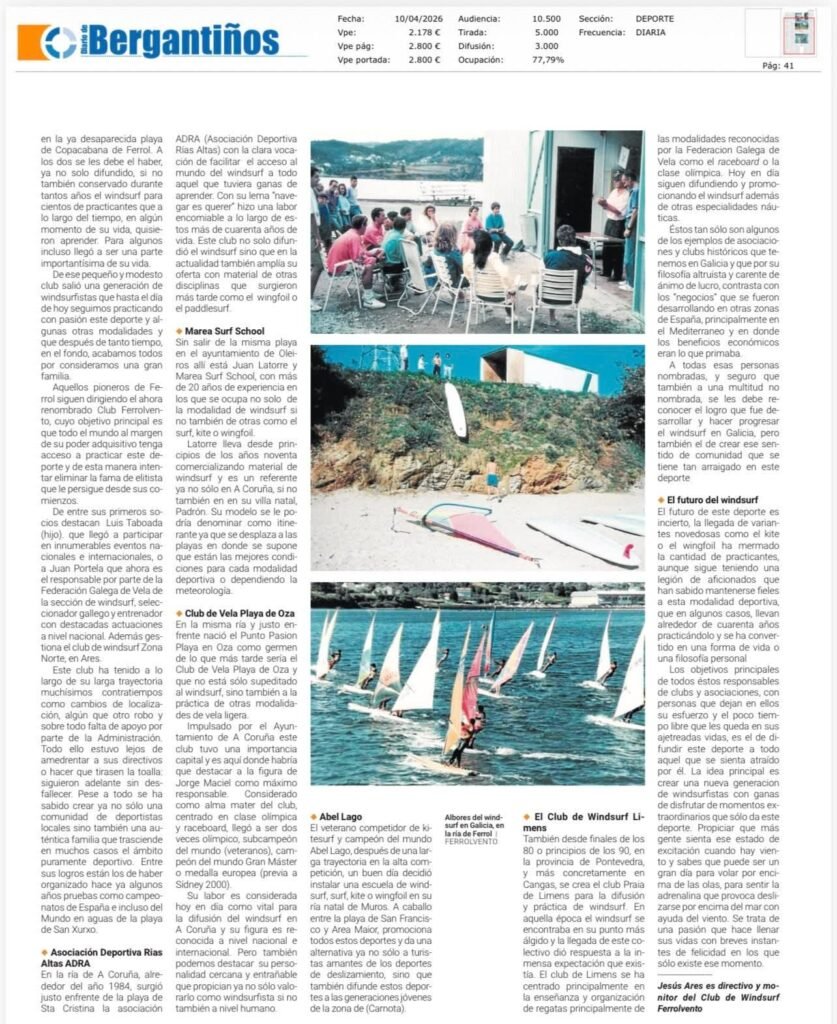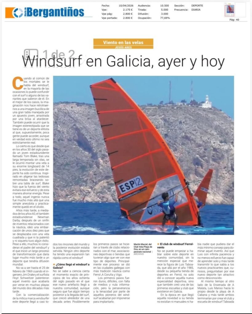 En Galicia, el windsurf no es solo un deporte, es parte de nuestra forma de vivir el mar. En un reciente artículo de Jesús Ares, antiguo directivo y monitor del club, publicado en DXT Campeón y en la edición en papel del Diario de Bergantiños (El ideal gallego), se hace un recorrido por su evolución, desde aquellos primeros años hasta el momento actual, en el que sigue muy presente en nuestras costas.